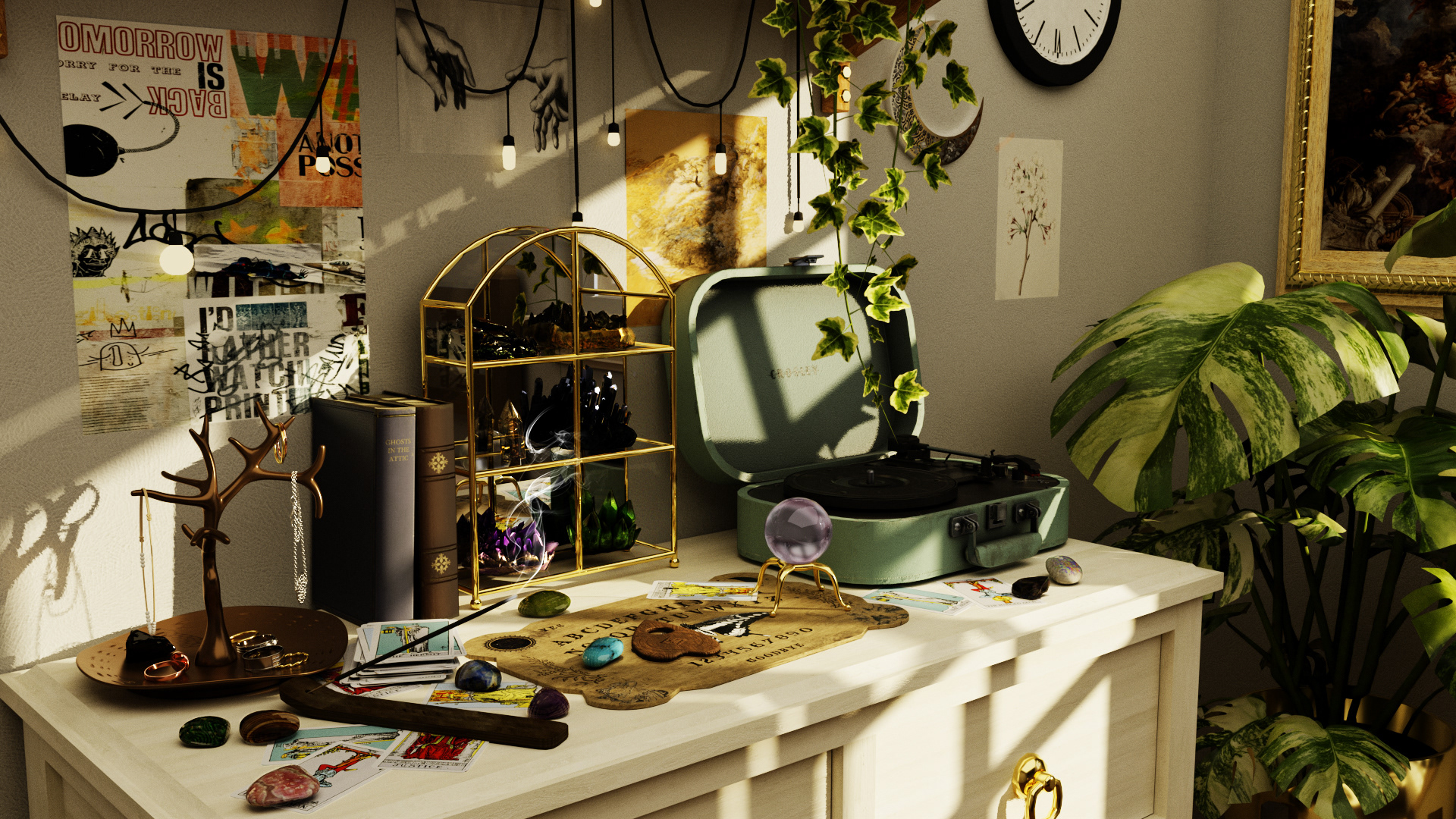 The aim of this project was to create a realistic still life. I decided to create a part of a room of a spiritual, modern witch, which I lightened in Maya, rendered with V-Ray and composited in Photoshop afterwards.
